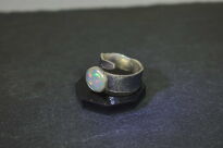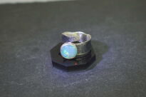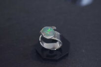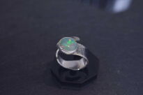 Niepowtarzalny pierścionek wykonany ze srebra próby 925, z okrągłym opalem etiopskim, który zachwyca grą barw od zieleni, przez błękity, aż po ogniste refleksy czerwieni.