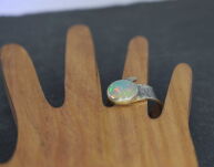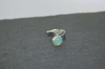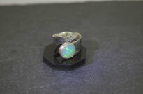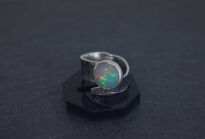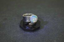 Niepowtarzalny pierścionek wykonany ze srebra próby 925, z okrągłym opalem etiopskim, który zachwyca grą barw od zieleni, przez błękity, aż po ogniste refleksy czerwieni.